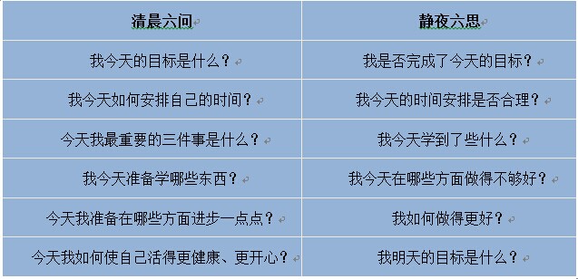 有公司管理人員專(zhuān)門(mén)設(shè)計(jì)了一個(gè)“員工每天自我思考六問(wèn)六思”表,在很多企業(yè)運(yùn)行,并且反映效果不錯(cuò)。