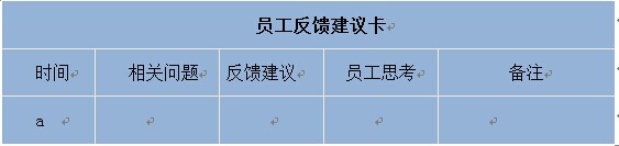 既然我們要求每一個(gè)員工都要隨時(shí)發(fā)現(xiàn)問(wèn)題,隨時(shí)反饋問(wèn)題,“好記性不如爛筆頭”,那么設(shè)計(jì)一張表格進(jìn)行記錄是最好的選擇。下表就是一張員工反饋問(wèn)題建議卡。